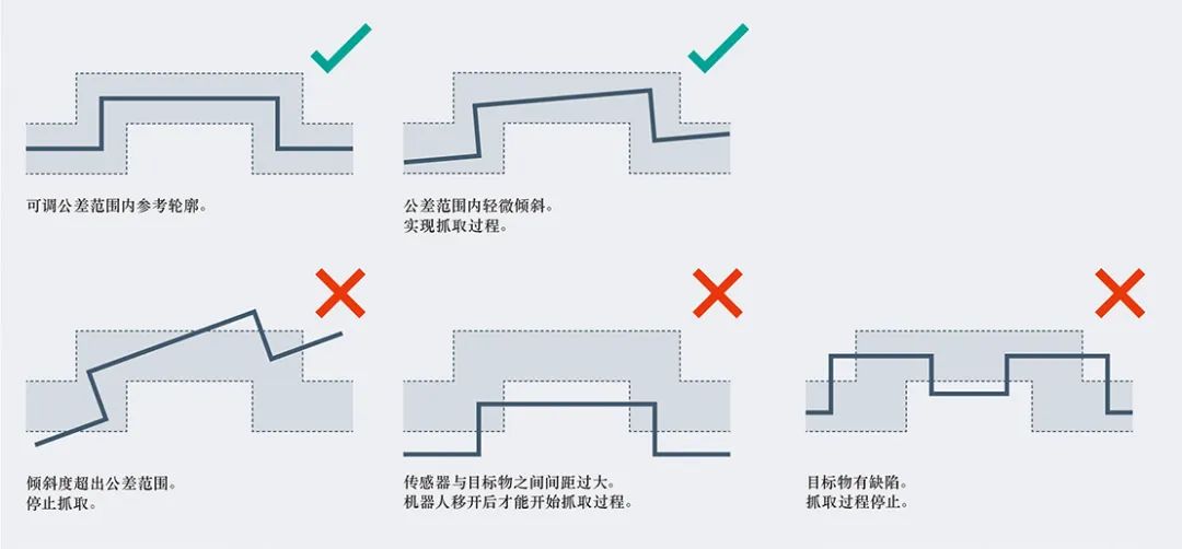 如上图所示,可以看出 Matcher 传感器如何比对物体的轮廓、位置以及基于可调公差范围的距离。“Good”信号1:Matcher 传感器识别出先前示教的参考轮廓。开始抓取过程。“Good”信号2:Matcher 传感器检测出公差范围内的轻微倾斜。开始抓取过程。“Bad”信号3:倾斜度超出公差范围。停止抓取过程。“Bad”信号4:传感器与目标物之间间距过大。机器人移开后才能启动抓取过程。“Bad”信号5:检测出目标物不正确或有缺陷。停止抓取过程。