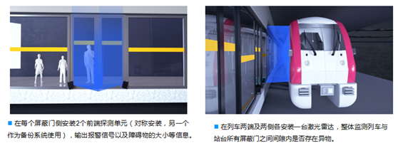站台与列车门之间具有空间小、距离远、亮度低等特点,本方案通过对列车门和屏蔽门之间的空间分析,采用具有先进感知性能的激光雷达作为探测装置,实时快速检测列车门和屏蔽门之间是否存在异物,在抗干扰性、精准度、可靠性等方面,比红外、视觉等传感器更胜一筹。