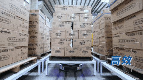 每台智能搬运机器人(AGV),一次能举起数百公斤的货物,现场无需看管,需要充电时会自行充电,夜晚也能在黑灯情况下照常运行。