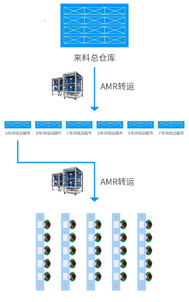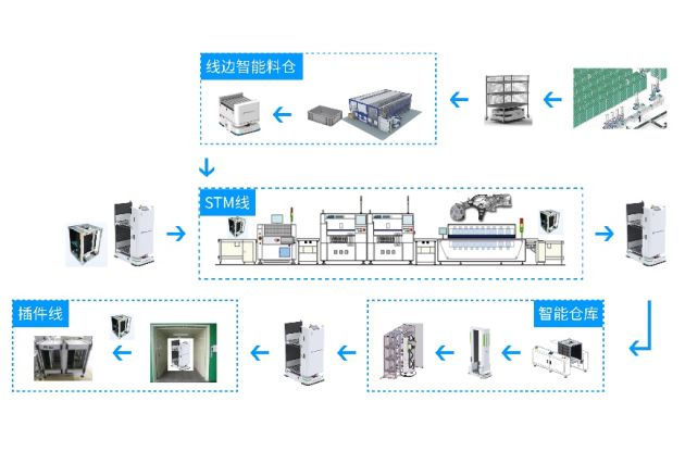 如在3C生产的SMT段,从总仓,到线边仓/备料区,到SMT产线,到SMT暂存,以及将SMT成品送到下一个生产工序。搭配仓库管理系统,仓储机器人,物料搬运机器人,智能电梯,中控及调度系统,实现全段的智能配送。