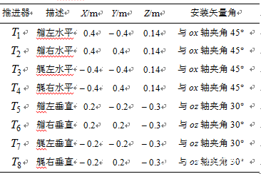 Kaxan水下机器人在水平方向上配备4个与艏向夹角45°的推进器,主要负责驱动水下机器人在水平面上作直线运动和转动。竖直方向上配备了4个与垂直方向夹角30°的推进器,主要负责驱动水下机器人做升沉运动。推进器在体坐标系下的安装角度及位置参数如表1所示。
