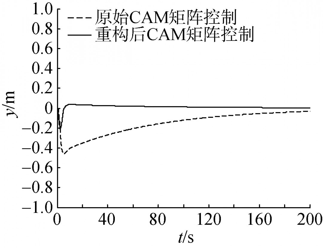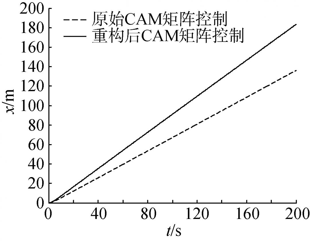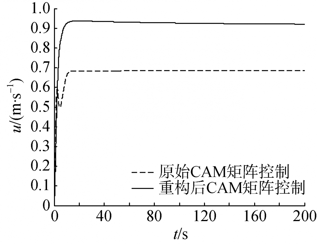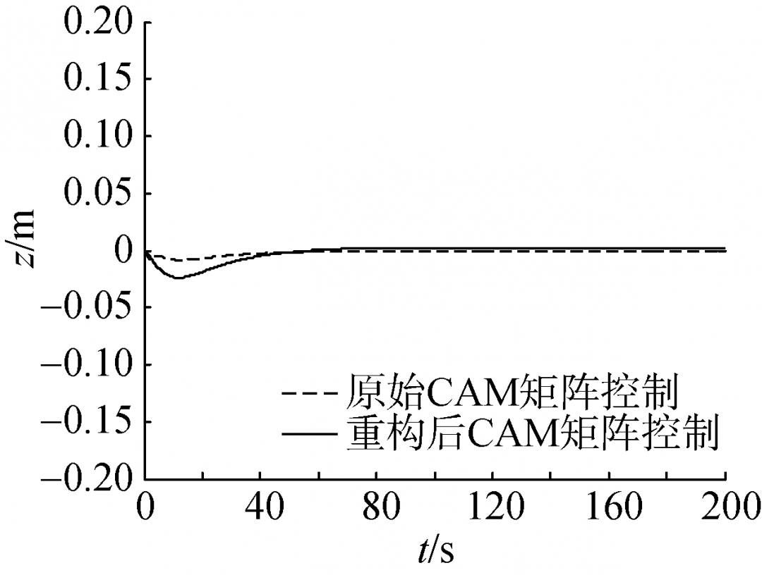 从图12和图13可以看出,在推进器T2出现部分故障不调整CAM矩阵时,稳定航行速度为0.687 m/s, 200 s内水下机器人在Oξ方向上前进了136 m。在重构后CAM矩阵的容错控制下,推进器T1和T4全速运转施加最大推力,推进器T3调整纵向偏差和艏向角偏差,使水下机器人保持固定艏向角-18.44°,即沿最大推力合力方向前行,稳定航行速度为0.92 m/s, 200 s内水下机器人在Oξ方向上前进了183 m,使得航行效率提升了34%。从图14和图15可以看出,当推进器T2出现部分故障时,垂向位移和横向位移也可以得到很好的控制,控制精度达到作业要求。