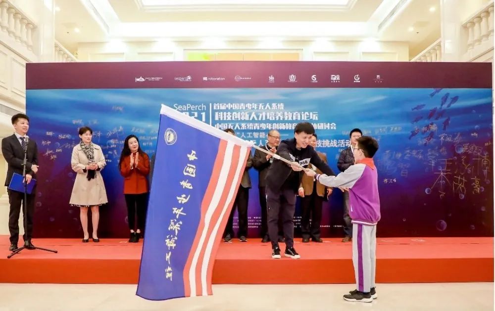 ↑参加竞技挑战学校列队,准备迎接挑战启动仪式上,2018年、2019年连续两年获得国际无人系统水下机器人大赛冠军的哈尔滨工程大学代表队领队教授,代表大学生组别世界冠军代表队,向中小学生代表授“中国青少年深海工程”战旗。