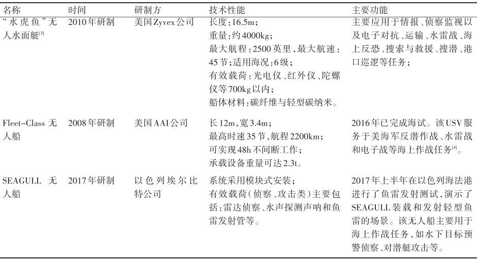 美国是研究无人船技术最早的国家,早在二战时期,美军就在无人船上架设了枪炮和导弹,通过远程操控来对敌人进行攻击。在20世纪60年代的越南战争中,美军使用内燃气动力的无人船队通过远程控制来执行扫雷任务。在20世纪90年代后期,美国海军研发了具有防御功能的“Roboski”号喷射性无人船,并于2000年初期开始在无人船上装载侦察监视类传感器,在沿海形成具有战斗力的无人船队。2007年,美国海军海上系统司令部(NAVSEA)所属的濒海水雷战项目执行办公室基于美国海军无人船作战需求和美国国防部2020年关于转变军事结构的发展目标出台了《海军USV总体规划》,该规划阐述了无人船的应用模式:反雷战、反潜战、反水面舰艇战、电子战、特种作战和海上反恐等。世界其它国家如以色列也研制了无人船,世界主要电子对抗无人船发展状况如表1所示。