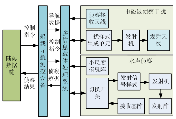 电子对抗无人船(ECUSV)可单艘或编队执行各类作战任务。通过对ECUSV进行任务、航路规划,提高协同能力,实现对海战场重点区域内目标的电子侦察与干扰,进而提升水面舰艇编队的整体作战效能。ECUSV与水面舰艇协同作战时,可通过对各类信号信息融合实现对重要目标的精确识别与定位,为使用反辐射武器、导弹、鱼雷等对重要目标进行火力打击行动提供目标情报支援。⒈单艘ECUSV作战单艘ECUSV作战主要用于对重点电子目标的跟踪、监视与干扰,其电子对抗载荷组成如图1所示。ECUSV侦察干扰系统主要对行动海区的重点目标信号如导航、电台、数据链、水下目标(如潜艇、航行器)等目标进行侦察与识别,并将获取目标信息传回情报处理中心进行分析融合,进而形成战场通用态势图;可根据作战行动的需要组织电子干扰;ECUSV还可用于对作战海区的电磁频谱进行管理与监视,保证己方作战行动频率的正常使用。总之单艘ECUSV可为海上作战行动中指挥员决策与火力打击提供强大支援。