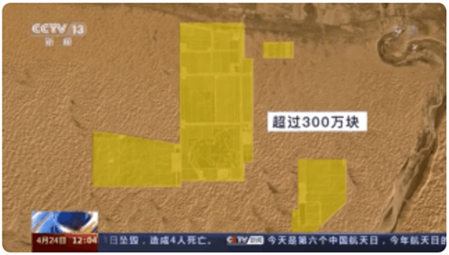 在内蒙古的达拉特旗,卫星发现了这样一个变化。近三年,在库布齐沙漠上,出现了大片的方格。经过确认,这是一排排的光伏板。仅这个骏马图案,就是由近20万块光伏板组成。目前,整个区域的数量超过300万块,是全国最大的沙漠集中式光伏发电基地。而且面积还将扩大,即将启动的三期项目一旦完工,整个基地的年发电量可达40亿千瓦时,相当于一个经济强县一年的全社会用电需求。