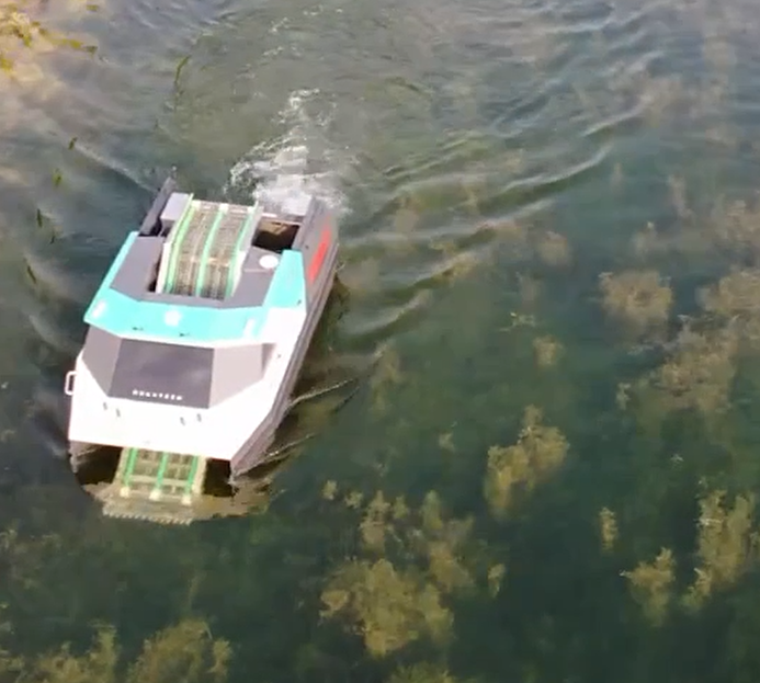 收割水草。TITAN割草船根据预设指令执行任务,遍历任务区域,完成水草的修剪,然后通过传送带运送到后方垃圾收集仓进行存储。