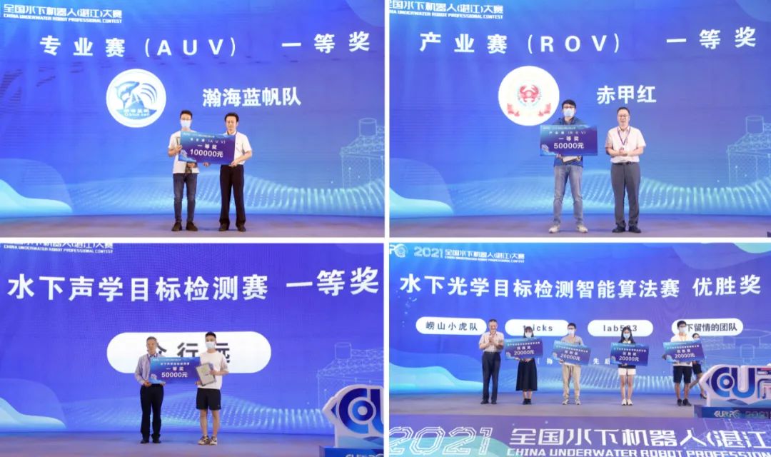2021年5月25日,2021年全国水下机器人(湛江)大赛现场赛圆满落下帷幕,天津瀚海蓝帆海洋科技有限公司“瀚海蓝帆”队、大连理工大学“赤甲红”队分别夺得专业赛一等奖和产业赛一等奖。同日,2021年全国水下机器人大赛线上赛战果正式揭晓,来自国内外的1492支参赛队伍经激烈角逐,最终由“众行远”团队斩获水下声学目标检测赛的一等奖,“手下留情的团队”、“lab523”、“tricks”、“崂山小虎队”四支队伍均获得水下光学目标检测智能算法赛的优胜奖。