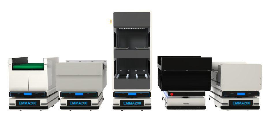 以迦智科技不同负载的自然导航AMR为底盘,搭载不同类型载具,实现与生产设备的“端到端”高效高精对接,助力用户实现多仓多产线间的原材料、半成品、制成品等的自主循环搬运与自动化上下料。