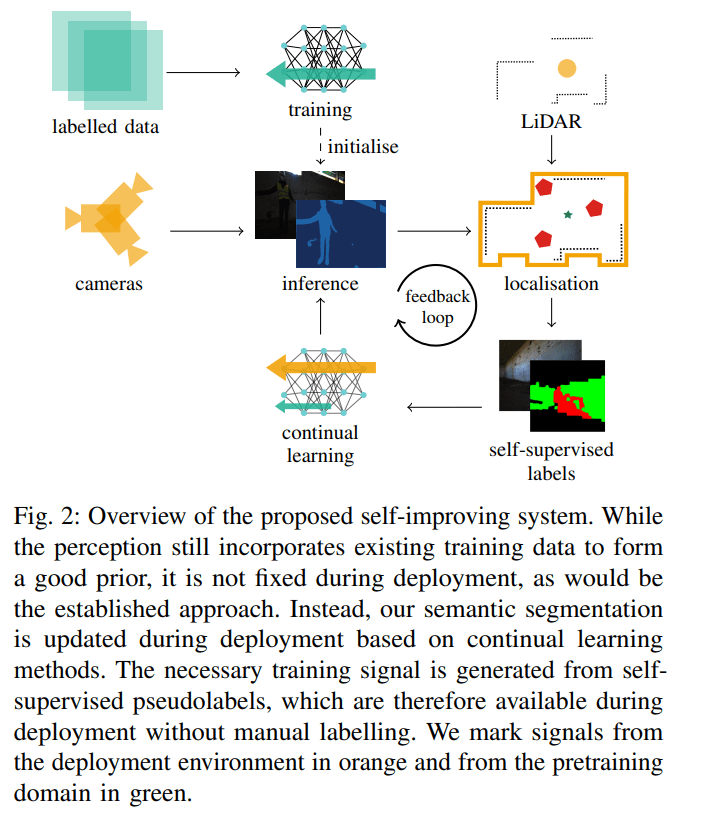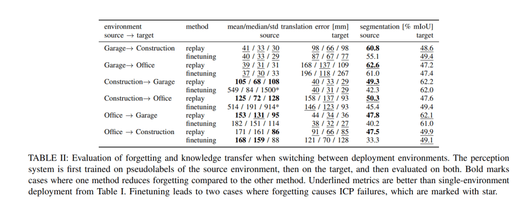 将这些部分放在一起,提出的自我改进感知系统将地图内的本地化与场景的语义分段互连起来。研究人员基于地图本地化创建伪标签,以训练语义分割,并使用此前景和背景分割来告知本地化,从而创建一个反馈环,从而对这两个部分都进行改进。该团队在增加复杂性的不同步骤和三种不同环境(建筑工地,停车场和办公室)中评估了所提议框架的性能。为了进行自我改进能力测试,将机器人部署在不同的未知环境中,并对获得的改进进行了测量。为了忘记和知识转移效果评估,在不同环境之间切换了部署。他们还进行了一项实验,以测试机器人的在线学习能力。