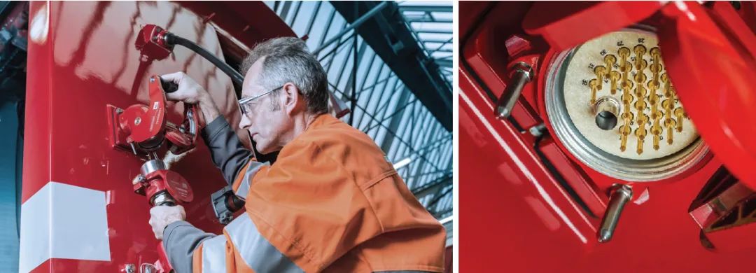 史陶比尔与RhB紧密合作,帮助制定技术规范,并开发了一款全新的解决方案。连接器外壳非常坚固,并配备一个手柄,方便轻松打开。接触部件充分搭接,确保即使遭受剧烈的振动和温差,连接也不会中断。插头与垂直方向保持 15°的夹角,大大降低了电缆带来的机械应力,并且极大简化了连接器的操作。保护盖结构可有效预防罩内积雪。插入后的连接器由两个纵向销支撑,保证连接器不会倾斜。
