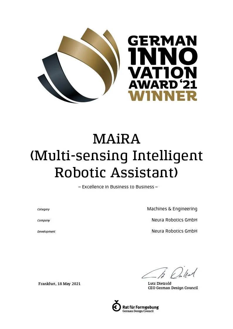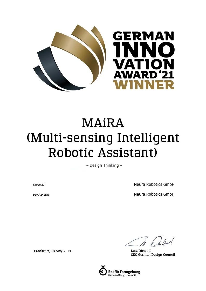 近日,2021德国创新奖获奖名单公布,大族机器人多感知智能机器人助手MAiRA包揽“设计思维奖”、“企业对企业卓越创新奖”两项大奖。