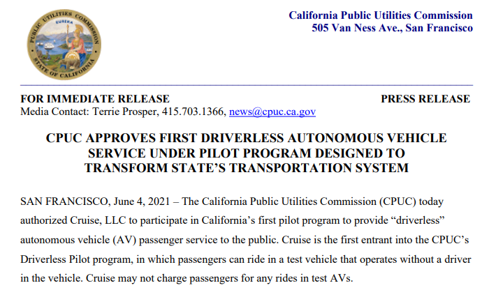 作为其无人驾驶试点计划的一部分,该许可证由加州公用事业委员会(CPUC)负责颁发,同时也是各家自动驾驶汽车公司在开展商业部署前必须满足的多项监管要求之一。