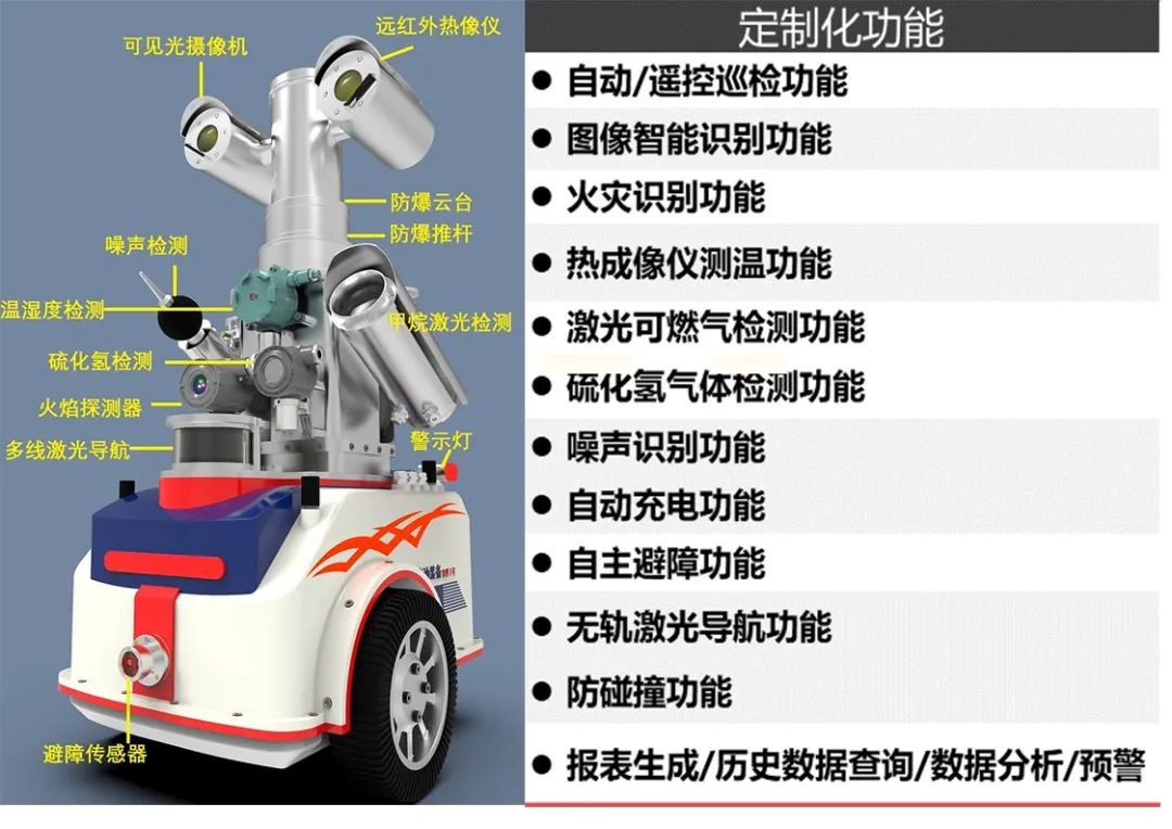 “智巡1号”后台系统具备强大的数据收集和分析系统,可以实现机器人状态管理、实时画面管理、巡检管理等6大基本功能,同时搭载有高清摄像头、红外热成像仪、可燃气体、硫化氢气体、温度等多种传感器能够实现图像识别、火灾识别、热成像测温、油气管线跑冒滴漏检测、有毒有害气体检测、噪音识别、温湿度检测等功能,完全满足平台日常巡检需求,同时可以实现在后台系统生成告警信息和巡检记录,此外,可与油田陆上终端或海上中心平台实现数据远程传输和机器人远程遥控。