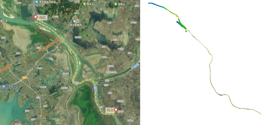 ▲左图:本次测量起止路线 右图:无人船实际勘测成果图