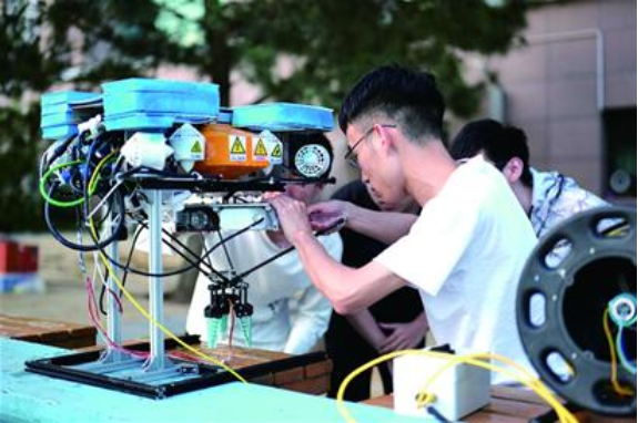 “第一版的机器人经过了多次调试,经历了错误频发的阶段,后来经过多次调试,多方查找改进办法,请教有经验的前辈等,又将原有机器人的部分零件卸下,把电路板拿出来,重新制作了第二版的机器人。 ”钟俊说,一个完整的水下机器人主要有金属框架、密封舱、浮体材料、推进器、机械手等多部分组成,因为旧版机器人诸多问题的存在,他们又重新返工制作了新版,“比如水下推进器的改进方面,原来的推进器一直感觉控制不了,难以解锁,后来经过多处查找资料,请教老师,我们才知道推进器自身有一个保护程序,需要指令解除后,才能控制自如。 ”钟俊说,参加机器人团队让他收获了很多,除了团结协作的精神,还有很多课本上学不到的知识,自主查询、学习让他们收获了更多信息,下面的决赛任务更多、综合性更强,他相信,大家群策群力,一定会取得一个好名次。