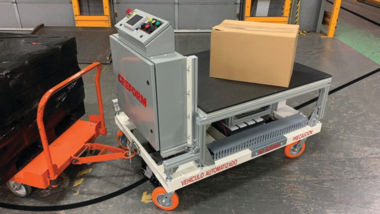 Creform为一家商用车零部件制造商设计并制造了一款牵引式自动导引车(AGV)。AGV拖着手推车在仓库和装配区之间来回运送生产零件。