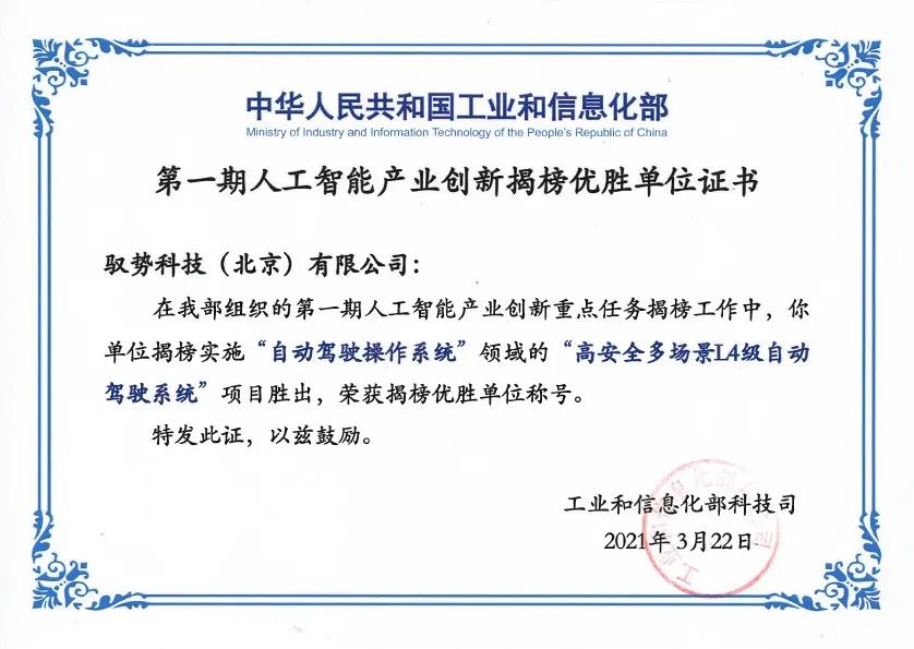 此次荣获工信部“新一代人工智能产业创新重点任务揭榜优胜单位”具有里程碑式意义,是对驭势科技自主研发L4级自动驾驶系统的充分认可,同时为驭势科技技术发展获得更大力度、更全方位的支持奠定坚实基础。