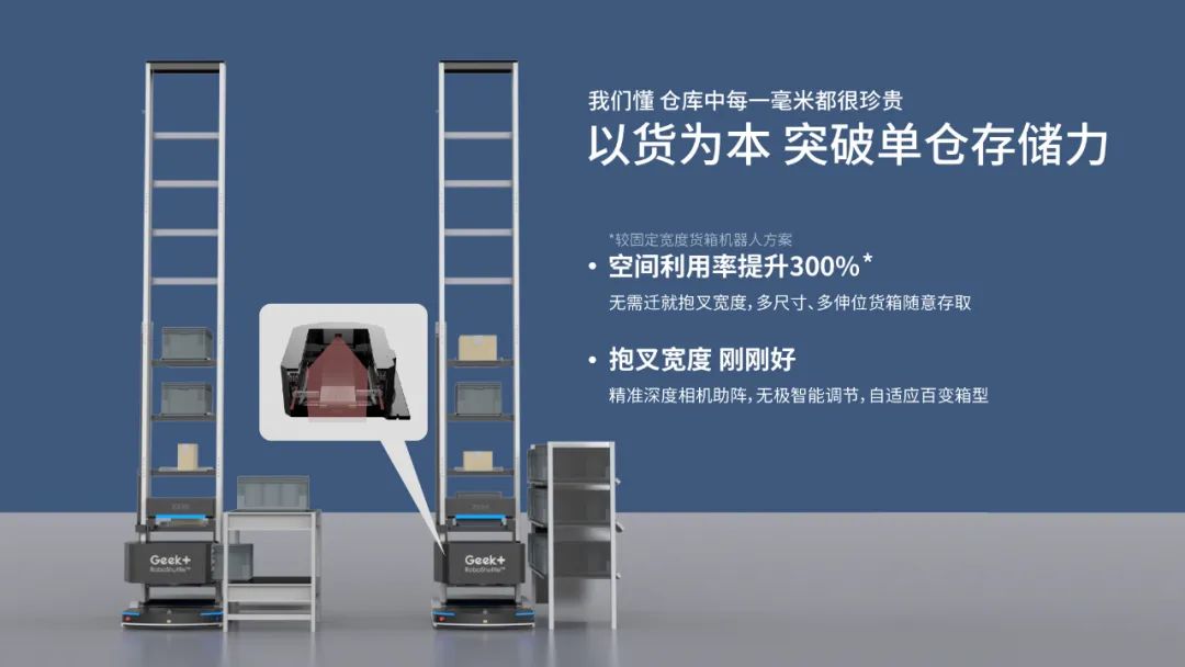极智嘉RoboShuttle® C200M-AW 智能调宽版货箱机器人可根据货品自动调整抱叉宽度,从而满足不同尺寸的料箱或纸箱的高密度存储,并支持货物原箱存储。C200M-AW货箱到人方案可根据实际货箱尺寸分配存储位置,保证货位间隔最小,减少存储空间浪费。通过最大限度地利用货架存储空间,C200M-AW智能调宽货箱机器人方案较比固定宽度货箱存储最大可提升3倍空间利用率,再次突破了机器人单仓存储能力极限。