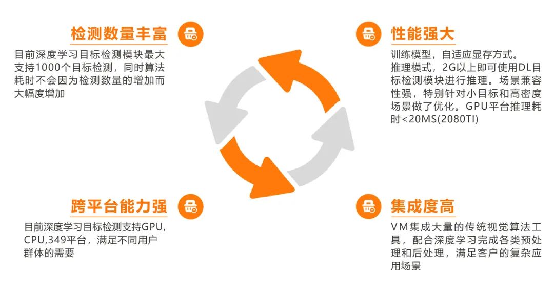 海康机器人目标检测算法支持检测目标数量为1000,支持GPU,CPU,多平台运行。强大的推理能力搭配VM传统算法的处理,可帮助客户应对复杂应用场景中的需求。