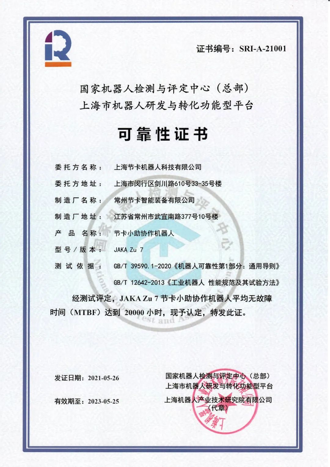 除了拥有CE、CR、ISO 13849、ISO/TS 15066等多项认证外,节卡机器人获得了2万小时MTBF(平均无故障时间)可靠性认证,成为业内首家,也是目前唯一一家通过MTBF 2万小时测试的协作机器人厂商。按照每年300天工作日,每天21小时的使用时间计算,机器人平均无故障约为3年。