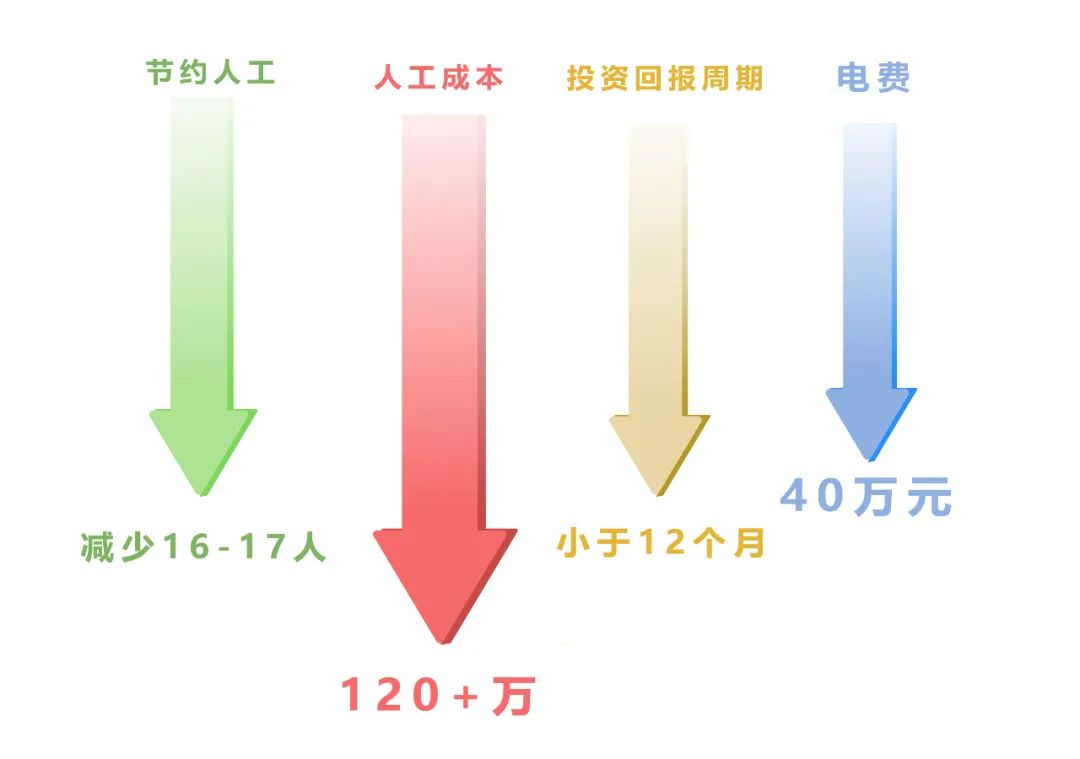 原先一条机床产线配有20个工人,现减少工人16-17名,以长三角地区平均工资为例,企业一年可减少人工成本120+万元,投资回报周期小于12个月。