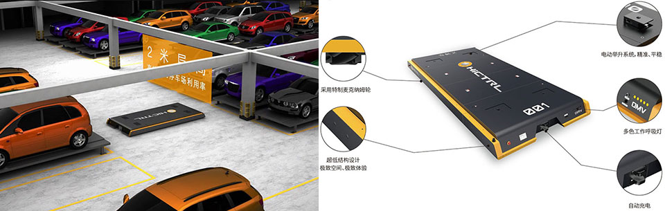 上海汇聚自动化科技有限公司利用麦克纳姆轮技术研发的自动停车机器人,实现无人化停车。驾驶员只需将汽车驶入快捷方便的停车平台,机器人将自动把汽车从停车平台搬运到停车位上,停/取车平均时间不超120秒。取车的时候,驾驶员可以选择手机支付或刷卡支付停车费,然后就可以在任意停车平台上取车。和传统停车相比,不需要人工寻找车位、倒车、寻找车辆和出口,停车收费等繁琐环节。无人化停车场充分利用有限空间,实现高密度停车,不需要多余的坡道、走道,更好的利用建筑网柱空间,可为现有停车场增加40%以上的停车位,解决目前停车难停车场无法增量改造的问题。