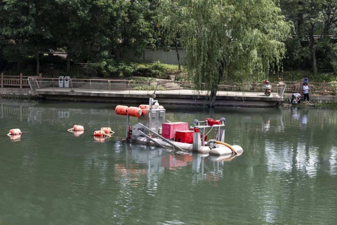 “无人船”像个行走的“吸尘器”,将淤泥搅碎并吸进运输管道,运至岸边集装箱,工作人员将淤泥脱水后打包装袋。区别于传统的干水清淤方式,通过整套设备,工人在不抽干河水、不破坏河道生态环境的情况下,可以完成对淤泥的常态化清理。