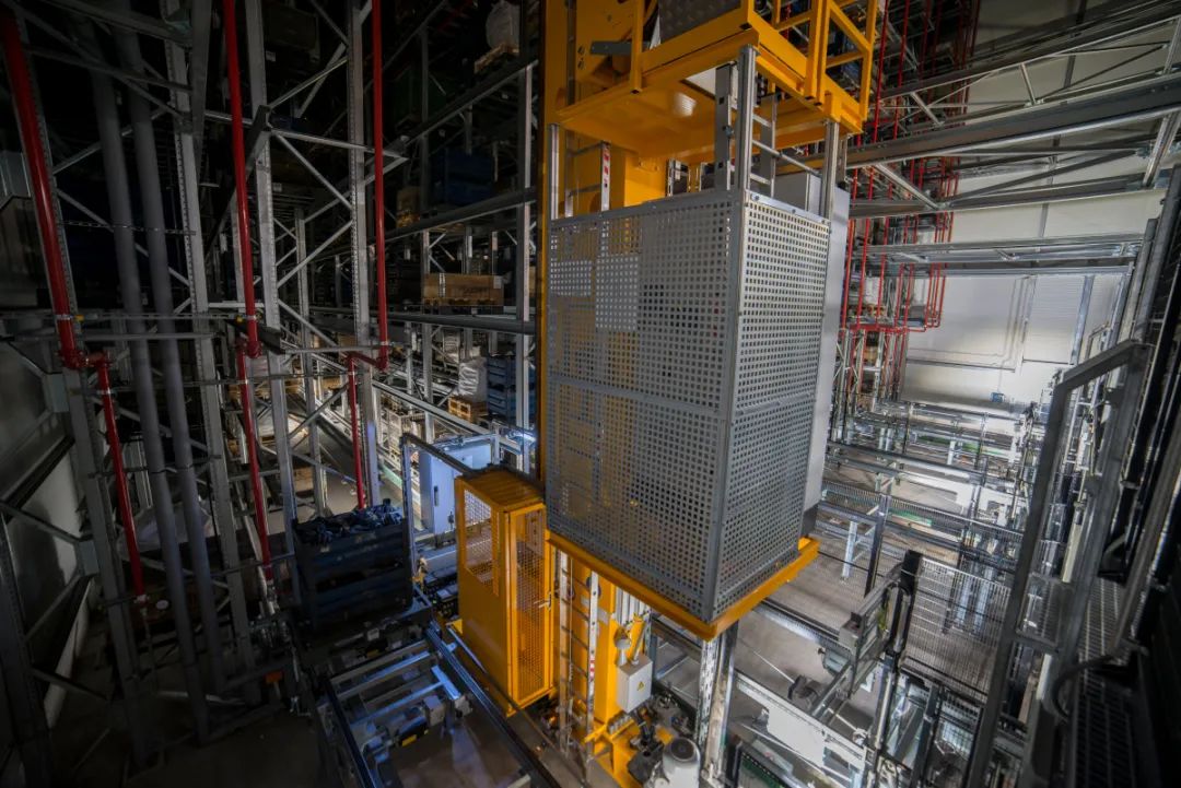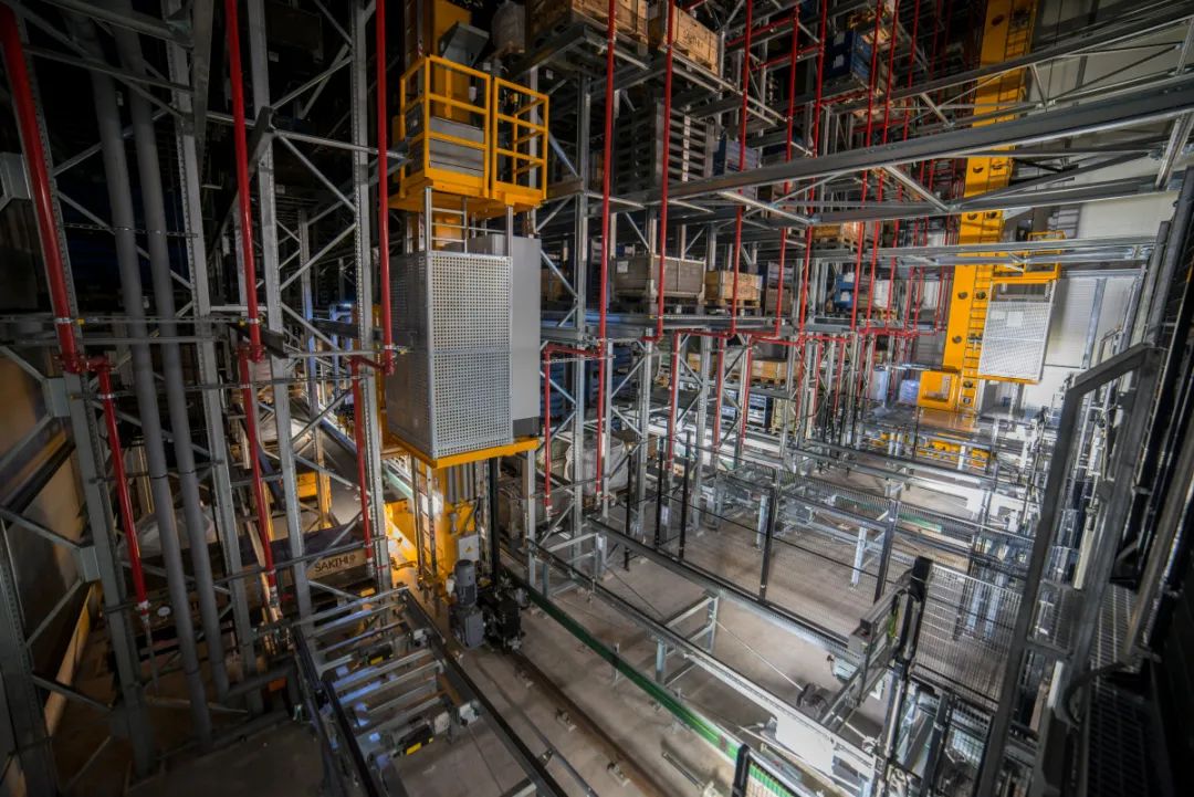 具有两个托盘一体库以及总计18.000 个托盘存储位的自动化仓库。