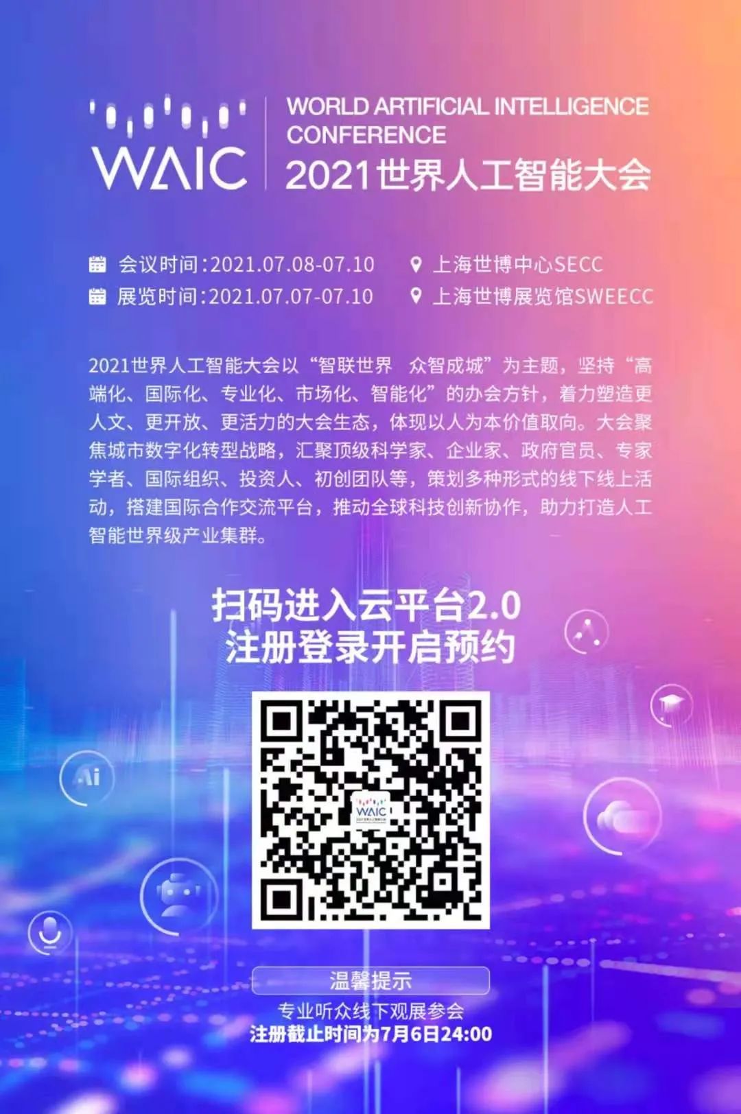 世界人工智能大会自2018年以来,已成功举办了三届, 2021年大会将继续秉持“智联世界”的理念,促进全球人工智能创新思想、技术、应用、人才和资本的集聚和交流,推动全球科技创新协同,助力打造人工智能世界级产业集群。