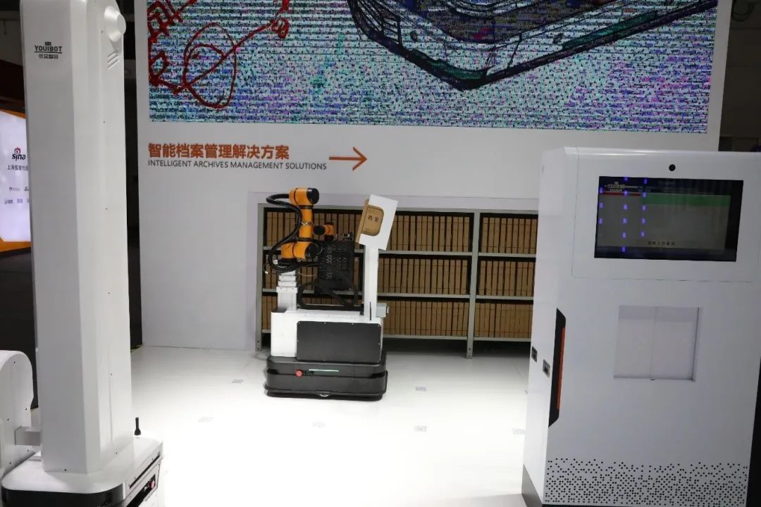 展会现场,优艾智合还展示了针对大型档案库房无人化改造的整体解决方案,广泛应用于人事档案、卷宗、图纸、文献等涉密资料管理。通过智能盘点机器人与智能存取机器人实现档案智能存取及盘点,搭载YOUI AMS档案管理系统,真正意义上实现档案物质载体的无人化、集约化管理,保证档案流转数据可溯,避免人工管理时存在的安全性风险。