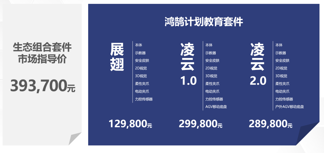 超值组合,构建优势学科视觉、夹爪、力传感器等周边配件是机器人方案常用的组合,而AGV是复合机器人的重要组成,在工业场景应用越来越广泛,整套组合在市场价格将高达40万不等,而越疆展翅售价仅129800元,凌云1.0售价299800元,凌云2.0售价289800元,这是越疆科技为支持人才培养给出的最大优惠力度。