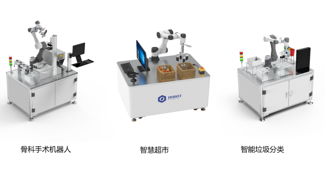 越疆与山东大学老师共同开发了骨科手术机器人、智能咖啡机、智慧超市、智能垃圾分类平台等实训平台,利用套件组合可灵活搭建贴近生活场景的案例,有效激发学生兴趣,同时满足了跨学科应用认知教学场景的需求。