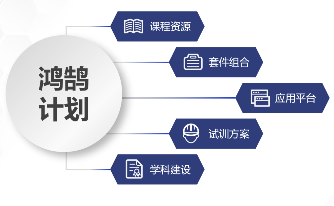 鸿鹄计划涵盖了课程资源、套件组合、应用平台、实训方案和学科建设等多项专业服务,旨在打通“产研学创”的链条,解决高校设备陈旧,优质课程及教学资源缺失等问题,为职校提质培优及科研创新应落地提供大力支持。