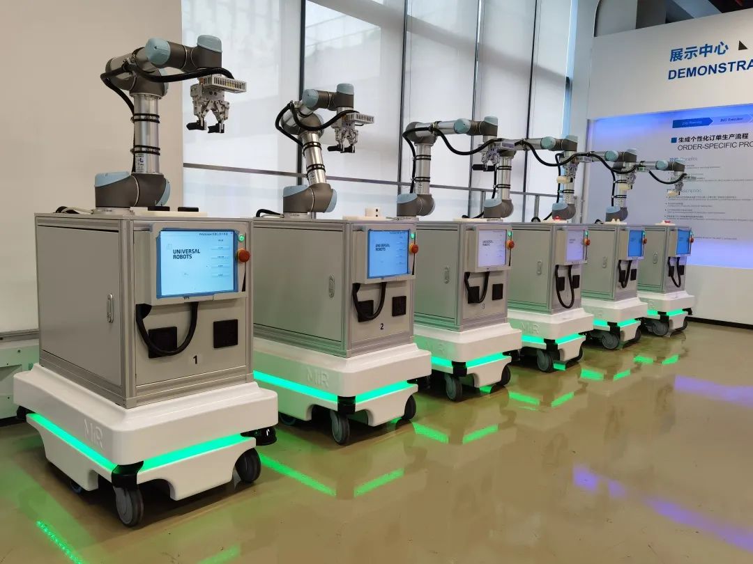 中德研究院展示与培训中心负责人刘轩表示:“展示中心和培训中心承载着对外展示智能制造方案及人员技术培训的功能,由于预计接待访客量大,且工作环境需要人与机器人在同一场景协同工作,因此高安全性成为其内部物流运输优化方案中不可或缺的关键要素。MiR自主移动机器人搭配UR协作机器臂的复合型协作机器人的高安全性为创造安全的展示和培训流程提供了有力保障。”