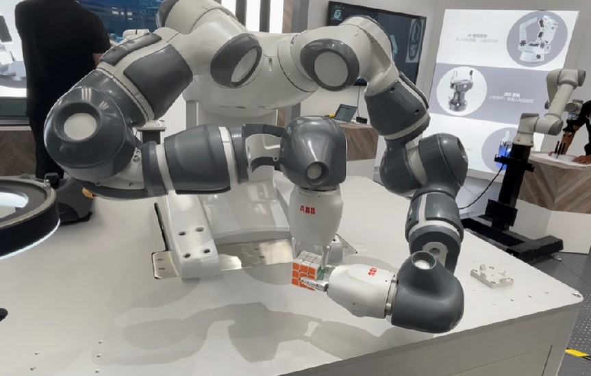 张江机器人谷未来体验馆内会拼魔方的ABB双臂机器人。新华网严曦梦 摄