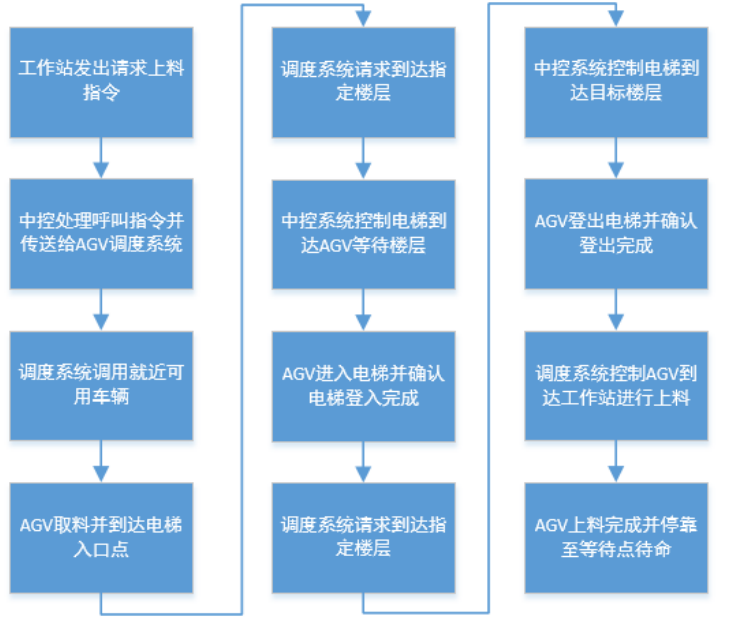 根据上海铁路通信有限公司对AGV的使用经验,其早期主要使用的单机AGV小车并无调度系统,单独一个AGV小车的工作场景并不复杂。然而,铁路行业流水线上的产品种类较多,以上海铁路通信有限公司为例,每个产品单批次内的数量相对较少,各产品的最基本单元是PCB(印制电路板)单盘,公司各生产车间分别位于不同的楼层。由于车间面积有限,每一车间只能完成有限的生产工序,中间产品不得不在各车间之间多次流转,复杂的流转路径导致占用人工过多,影响整体生产节拍。单机AGV小车虽能在一定程度上降低工人劳动强度、局部解决物流流转运输自动化水平,但并不能从整体上有效解决多线路、多车次、跨楼层之间的物料流转。