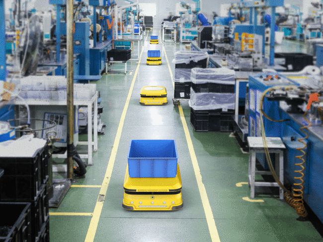 AGV移动机器人将纸、布匹、金属材料、橡胶、塑胶等原料从仓库自动运输到生产流水线,叉式AGV小车还可以从地面、货架、支架、运送机上自动取放货物;