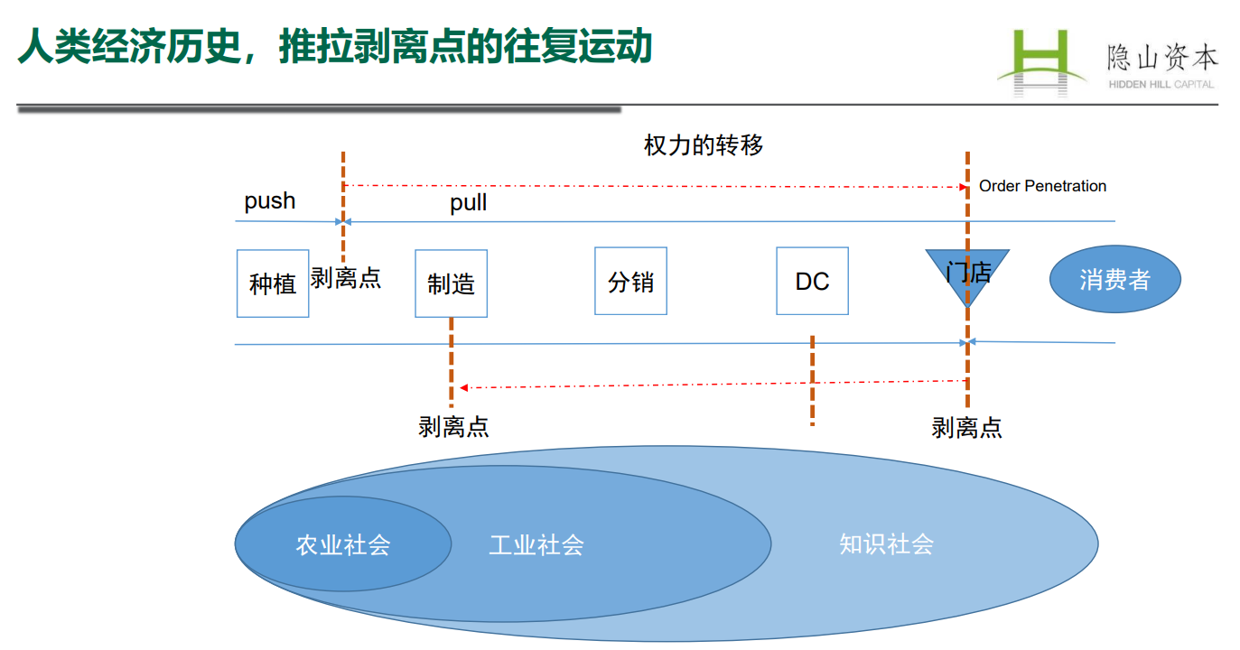 人类经济史是推拉剥离点的往复运动。从自给自足的农业社会,到大规模生产的工业社会,推拉的剥离点不断向外扩展,从种植、制造、分销、零售等环节推到零售门店的柜台。进入知识社会,订单流、金流都可以线上解决,剥离点开始往回推到了仓库,下单后仓库会将货送到消费者手上。在这个过程中,“人、货、场”发生了重构,门店面临倒闭调整的风险,也产生了即时配送、社区团购等结构性机会。