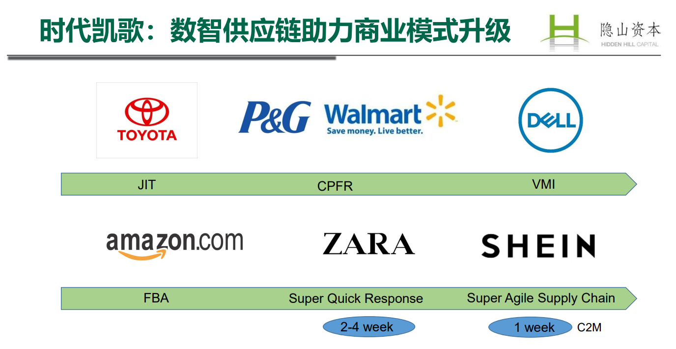 从JIT(Just In Time,零库存精益生产)、CPFR(Collaborative Planning Forecasting and Replenishment,协同规划、预测和补货)、VMI(Vendor Managed Inventory,供应商管理库存)、FBA(Fulfilment by Amazon,亚马逊履约)到“超级快速响应”乃至“超级灵活的供应链”,每一次供应链上的改革,都诞生一个伟大的企业。理念的引导、体系的支撑、持续的改进,支持他们成为伟大的企业。但在不同时代,他们会被淘汰,是因为权力转移了,权力从制造业转移到渠道,转移到电商,又转移到消费者身上。