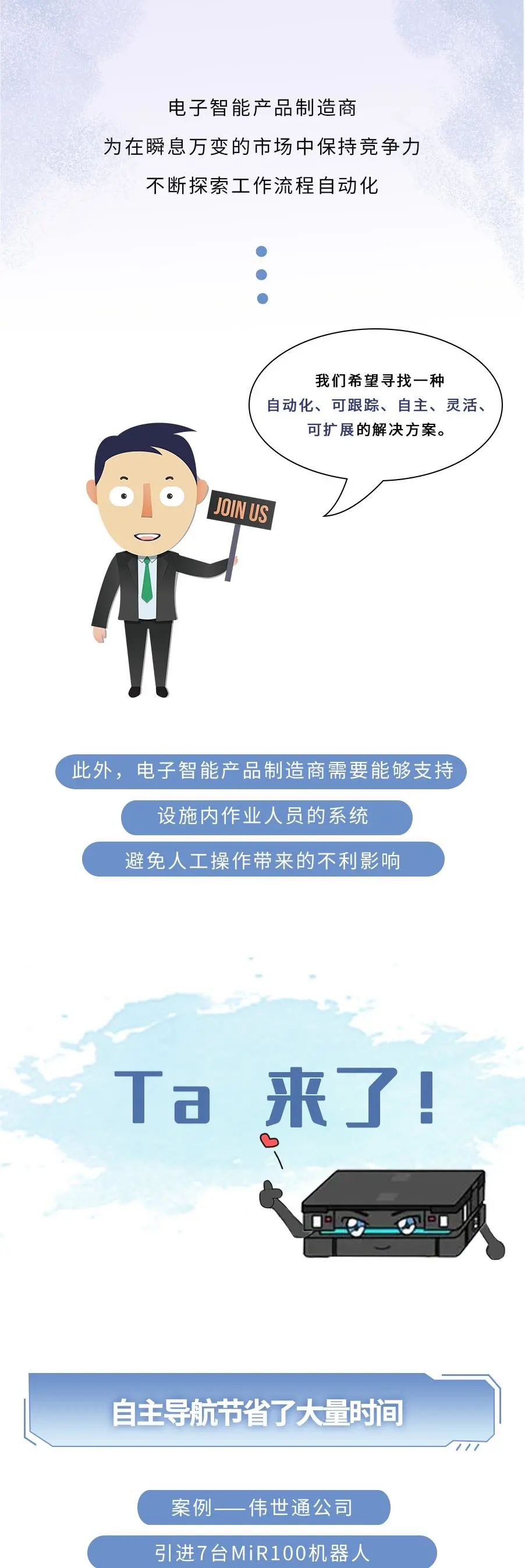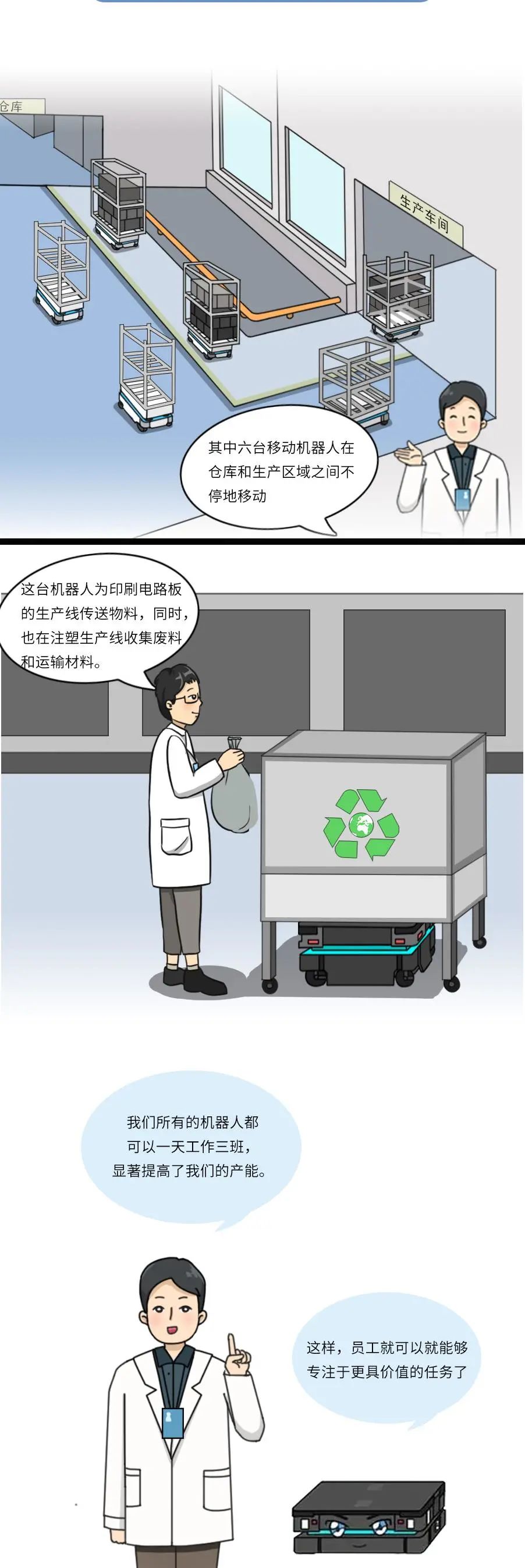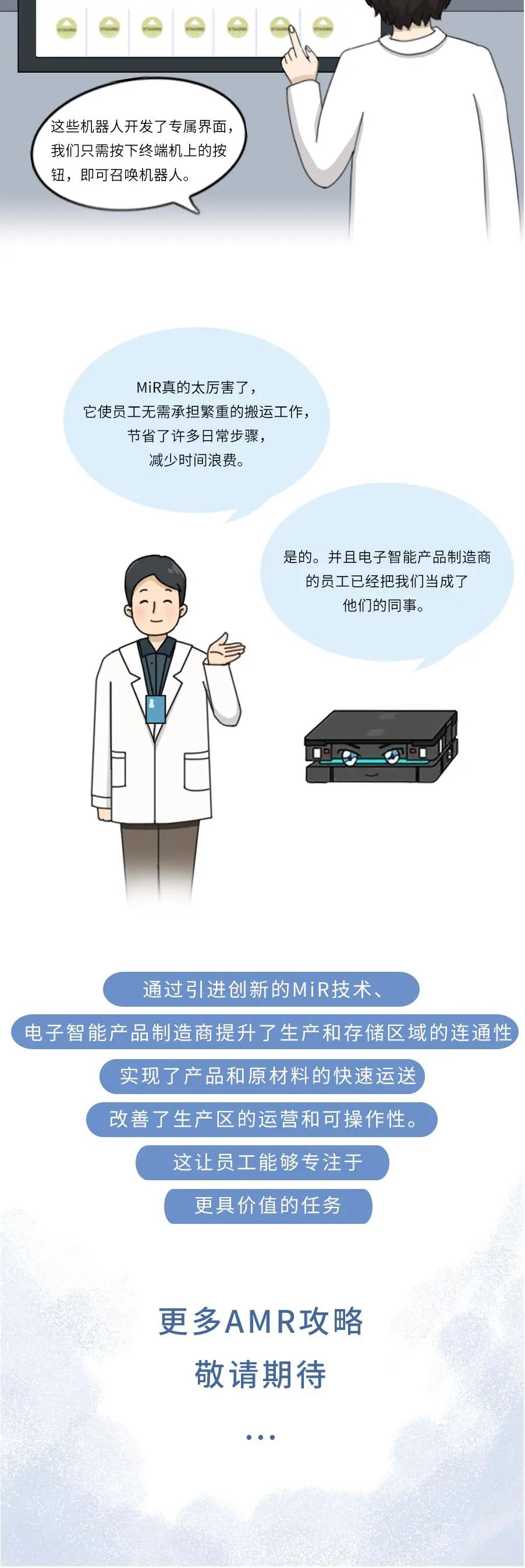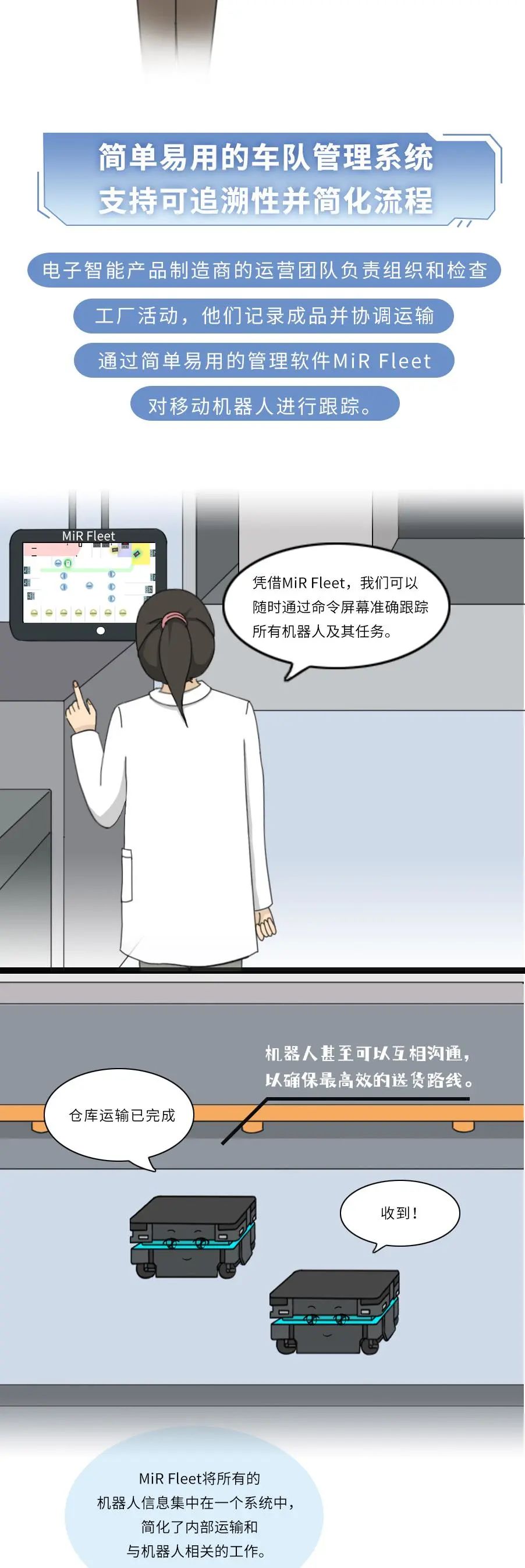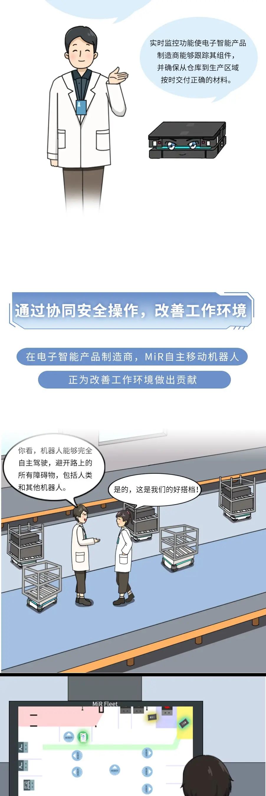 MiR致力于研发简单易用且灵活安全的机器人,帮助各类公司提高运营效率。MiR的自主机器人是新一代的先进移动机器人,具有投资回报快的特点,通常一年内就能收回成本。这些独特的协作机器人现已在工业及医疗保健行业大放异彩,帮助这些行业的制造商实现内部运输自动化。