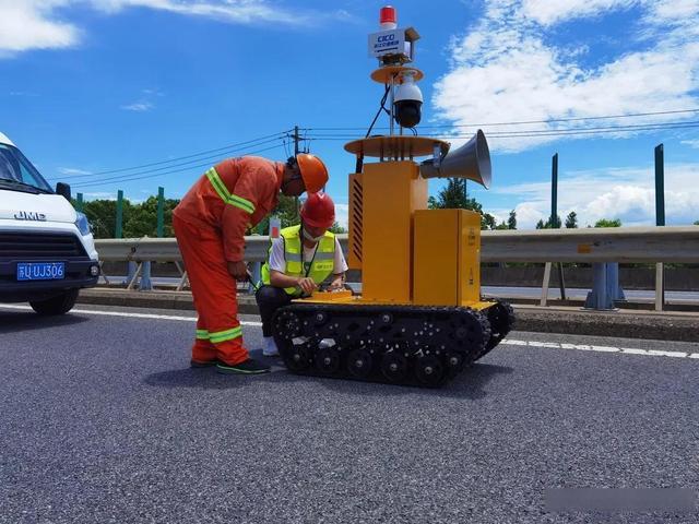 近日,G50高速养护施工现场多了一台机器人“养护管理员”,不仅能在现场来回跑,摄像头“眼睛”还能时刻监管现场,一旦有工人或设备出现违规、带隐患作业等情况,还能发出语音警报……这个“养护管理员”就是近期刚刚“上岗”的新式施工监管装备,这也是全国首台高速施工管理巡检机器人。