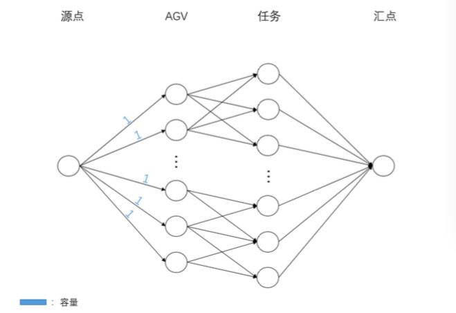 考虑一个典型的场景,每辆AGV仅可同时执行一个任务,那么每辆AGV到源点的容量均为1. 任务到汇点的各条边容量显然均为1. 如果某个任务能被某个AGV执行,则有从该AGV到该任务的有向边,其容量为1。每条边的成本综合一下几点得出:(1)任务优先级分数(2)AGV优先级分数 (3)搬运成本。