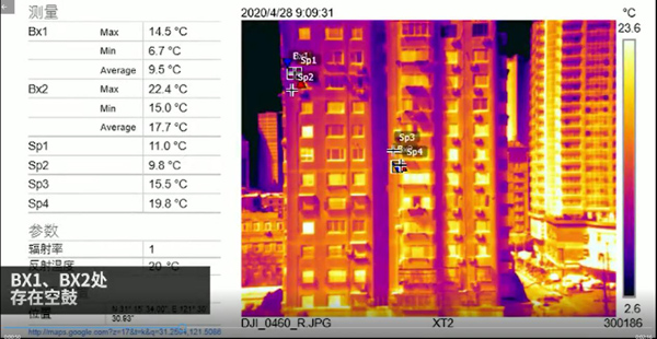 無人機在大樓周圍飛行,對應的熱力圖和三維數字模型就顯示在了智能巡檢平台上,通過對比照熱圖上的光斑以及現場照片,就可以精准確認滲漏水點、面磚飾面保濕層起殼等問題。同時,街道房管辦組織業委會聘請專業鑒定機構出具詳細的檢測評估報告,擬定整治方案。