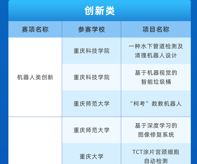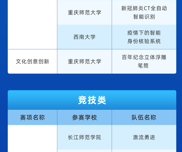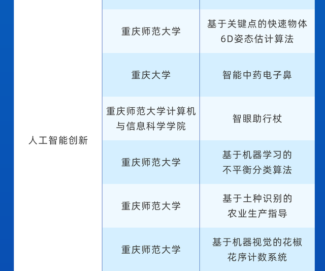 其中,重庆师范大学无疑是最大的赢家,“柯考”数教机器人、基于深度学习的图像修复系统、智眼助行杖、新冠肺炎CT全自动智能识别、百年纪念立体浮雕笔筒等十支队伍入选。重庆工商大学、重庆大学、重庆科技学院等学校同样有不俗表现。