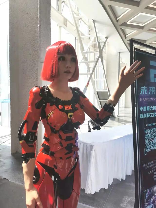 身穿机械装甲的红发“金小普”,尽展女性机器人的流线美。走近细看,从眼神、举止到皮肤和指尖逼真呈现,轻轻触摸其皮肤,质感几乎和真人一样。