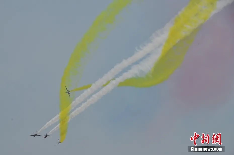9月28日,广东省珠海市,红鹰飞行表演队进行飞行表演。当日,第十三届中国国际航空航天博览会在珠海国际航展中心开幕。中新社记者 陈文 摄