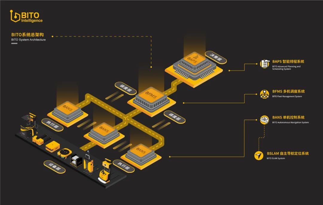 在成立以来的短短几年内,宾通智能在技术上的成果有目共睹,至今已经形成了从决策层到调度层再到执行层的完整产品体系。实时排产产品BAPS“刘邦”可以根据订单需求实时更新生产计划,动态调整生产计划;多机调度产品BFMS“韩信”可以接收最优生产决策并下发任务指令,实时追踪任务执行情况;单机控制产品BANS“愚公”与导航定位产品BSLAM,搭载在工业移动机器人和无人叉车里,作为数据采集与执行的端口,实时向“韩信”上报任务信息。