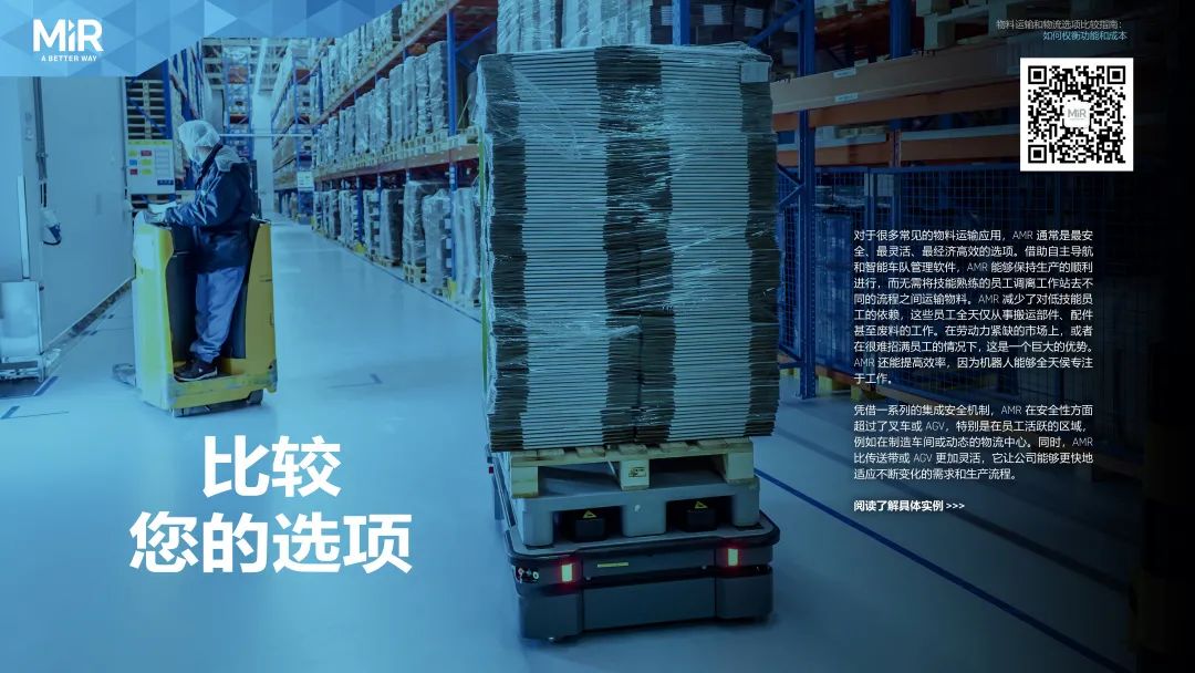 如果您准备在制造工厂、仓库、配送中心实现物料运输自动化,您有多个选项。这些选项包括传统的叉车和传送带,还包括自动导向车(AGV),以及当今的先进自主移动机器人 (AMR)。但有了所有这些选项,您做出正确决策的压力更大。