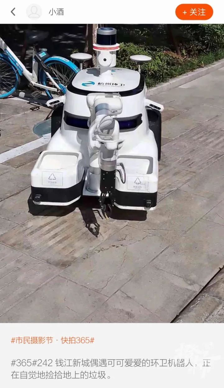 这张照片是我妈妈拍的,他已经六十多岁了。那天下午,在庆春东路一个车站等车的时候,看到两只非常可爱的小机器人,当时车站边上刚好有垃圾,机器人便过来捡起来了。妈妈觉得这机器人很可爱,就拍了下来,也分享给了我。